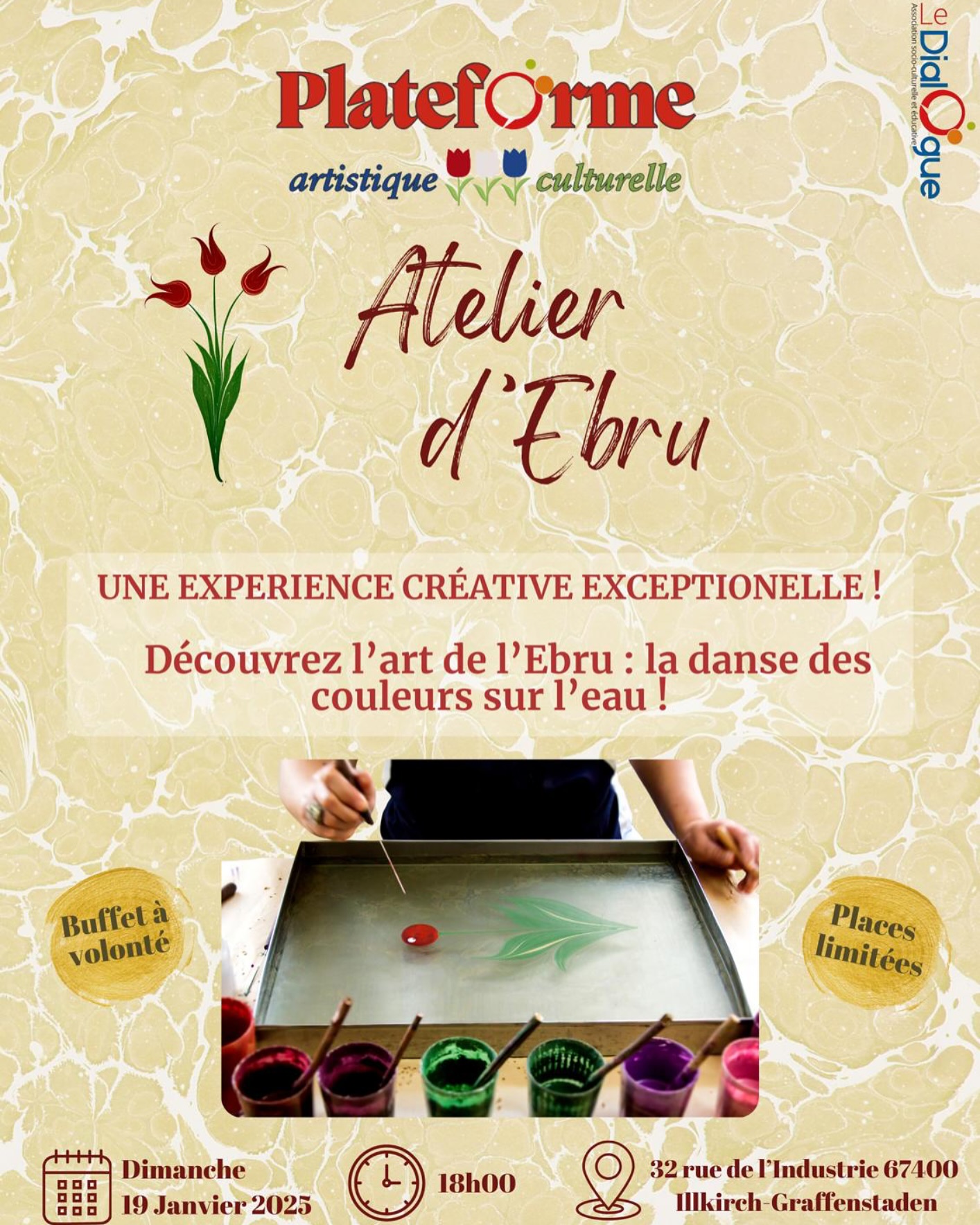 En janvier 2025, l'association Le Dialogue a inauguré sa nouvelle Plateforme Artistique et Culturelle (PAC) avec un tout premier atelier d'Ebru, l'art traditionnel de la marbrure sur papier.